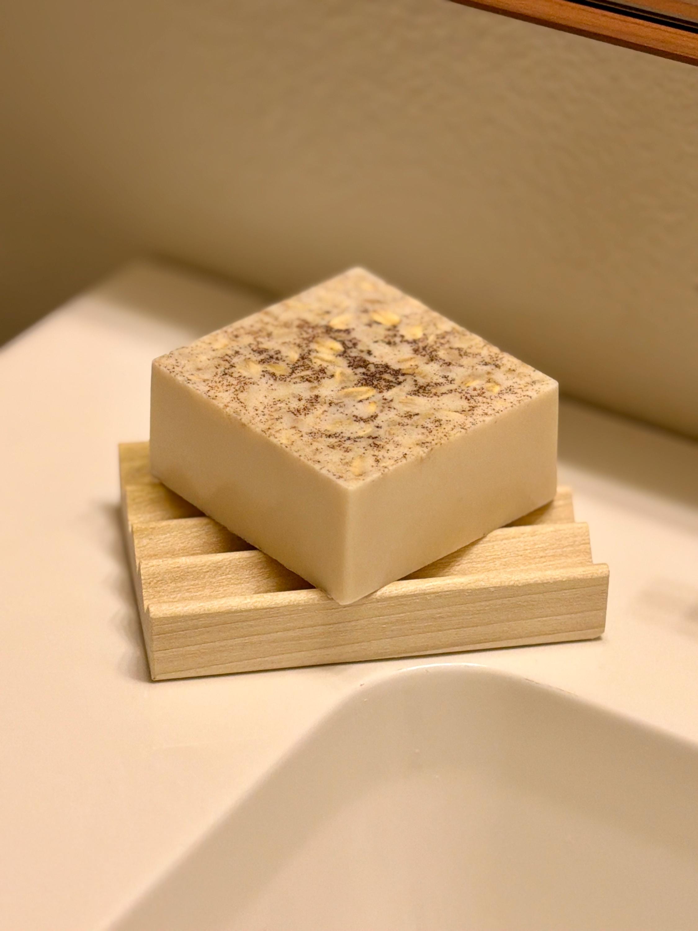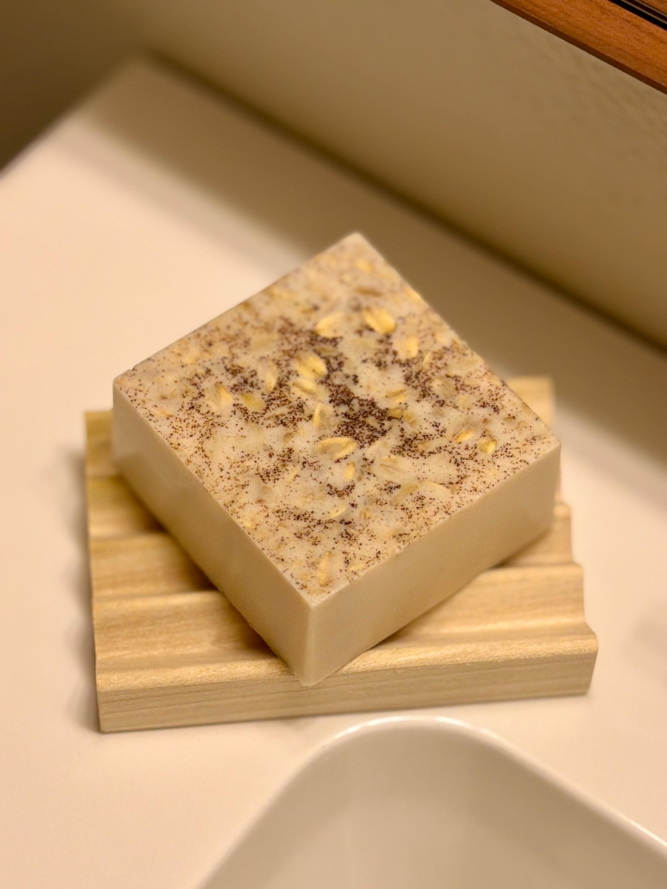 Wonderfully soothing and deliciously scented. Oatmeal flakes and cinnamon have been added to this soap for extra indulgence. This soap is perfect for those with sensitive skin. Made from a shea butter for extra softness. This bar is about 2 1/2 inches long and 2 1/2 inches wide.
